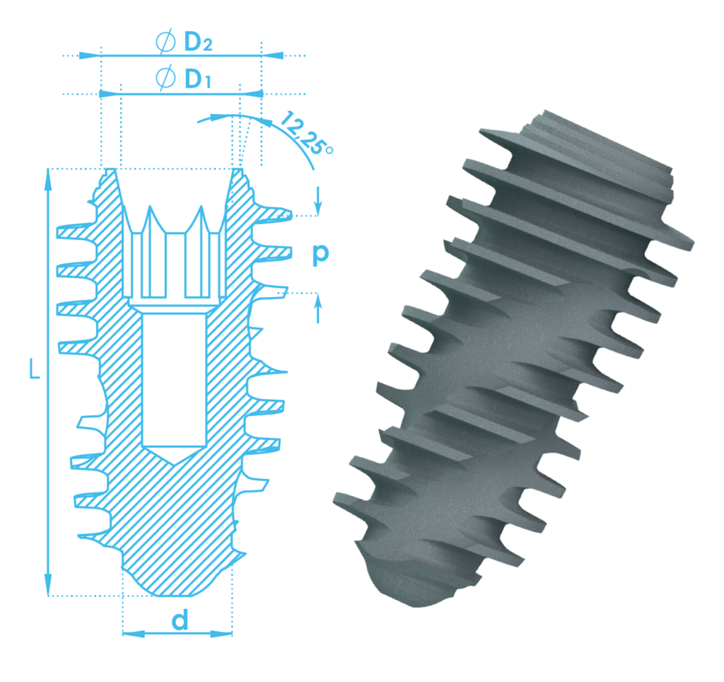 - Ren xoắn kép Double Thread giúp phân tán lực đều, tăng độ ổn định ngay cả ở xương mật độ thấp.